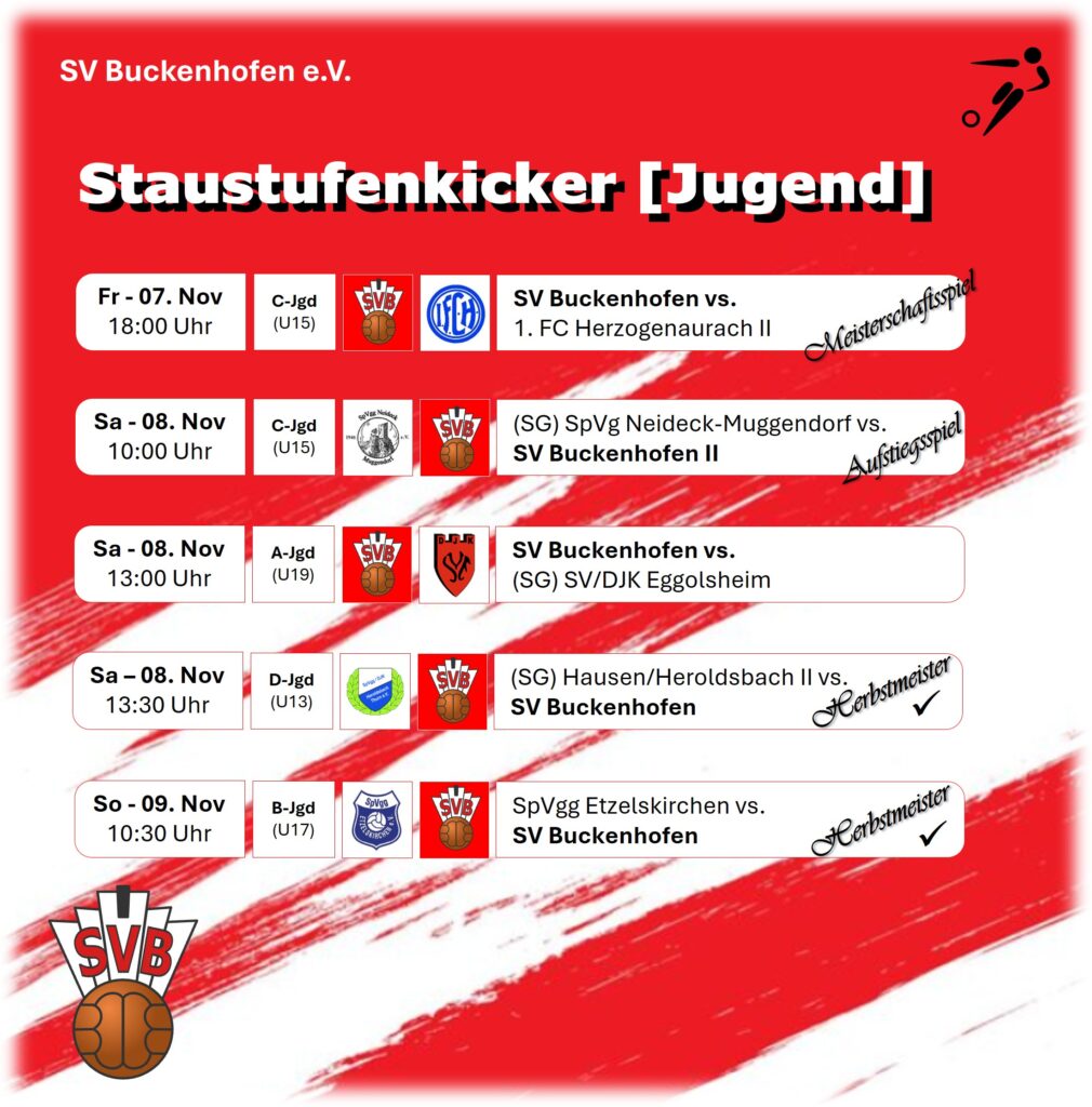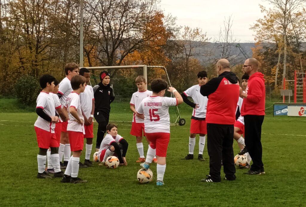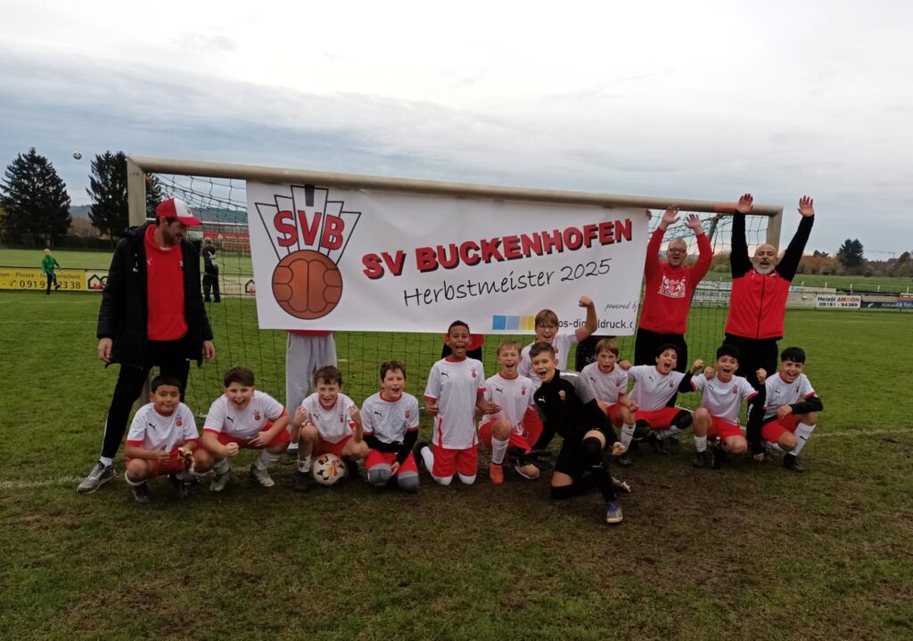 Die Tabellenspitze konnte hingegen die D-Jugend des SV Buckenhofen ebenfalls am Samstag, den 01.11.2025 bereits verteidigen und sogar vorzeitig die Herbstmeisterschaft feiern. Als Gäste reiste der Zweitplatzierte der Tabelle – die SpVgg Reuth an. Mit einer knappen 1:0 Führung ging die Heimmannschaft von der Staustufe in die Halbzeit. Chancen gabe es bis dato auf beiden Seiten, wobei der Spielanteil deutlich auf Seiten des SVB lag. Lediglich durch lange Bälle versuchten die Reuther ihre Stürmer zu bedienen. Eine taktische Umstellung in der Aufstellung und die langen Bälle konnten frühzeitig abgefangen werden. Am Ende siegten die Staustufenkicker nach einer 4:0 Führung noch mit 4:1. Ein Gnadentor erzielten die Gäste kurz vor dem Abpfiff. Durch diesen Sieg ist die D-Jugend vorzeitig Herbstmeister und bestreitet ihr letztes Ligaspiel der Herbstrunde am Samstag, den 08.11.2025 in Hausen/Heroldsbach.