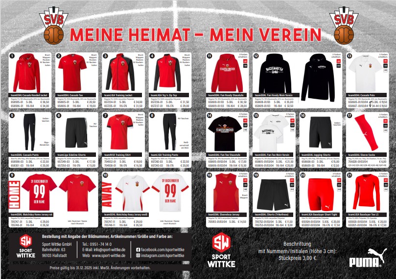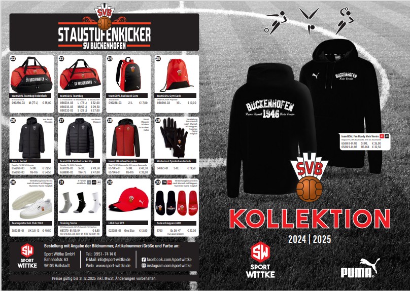 Mit der Teamwear – Kollektion 2024/2025 des SV Buckenhofen habt ihr für jeden Anlass die richtige Auswahl. Diese wurde mit unserem Kooperationspartner Sport Wittke aus Hallstadt entwickelt.