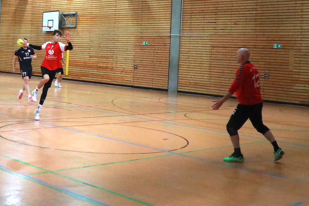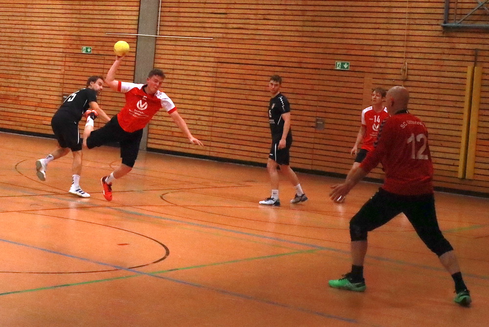 Nachdem Hübenthal in der zweiten Welle mit einem sauberen Haken den Schiedsrichter aussteigen ließ, hob Iov den Ball von Linksaußen sehenswert über den SCU-Routinier Hentschel. Mitte des ersten Durchgangs parkte L. Hoh völlig allein gelassen am gegnerischen Wurfkreis, Kallenbach spielte einen präzisen Zwölfmeterpass – 7:14. Den Pausenabstand durfte Oldie Jo Gumbmann vom Siebenmeterstrich besorgen, das aber nur, weil Spielertrainer Noppenberger auf der Bank Platz genommen hatte.